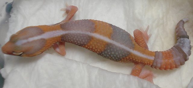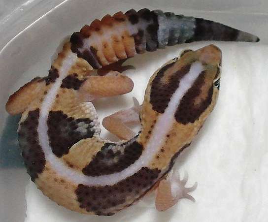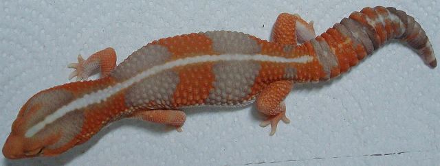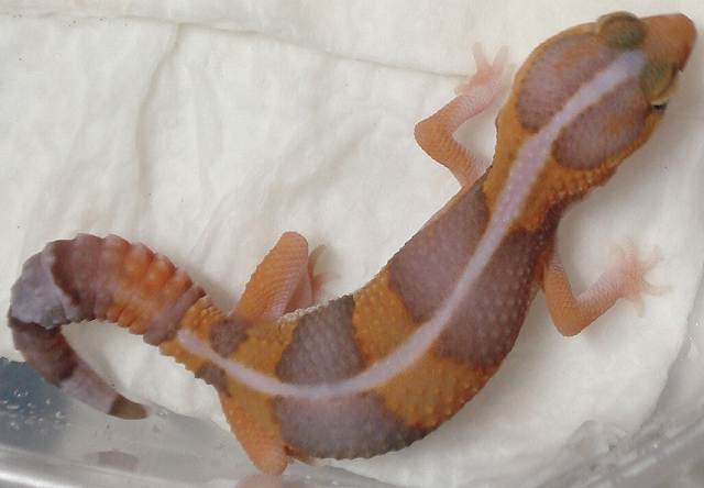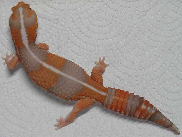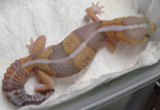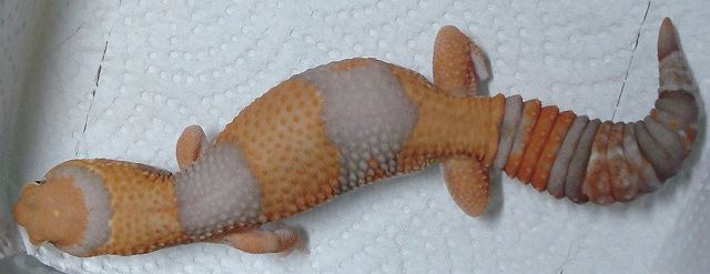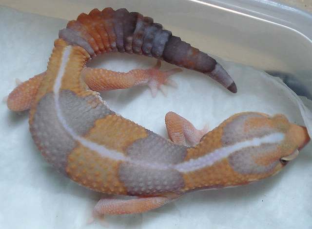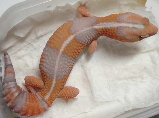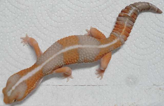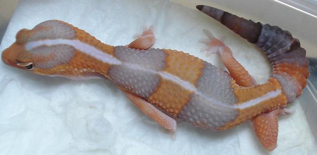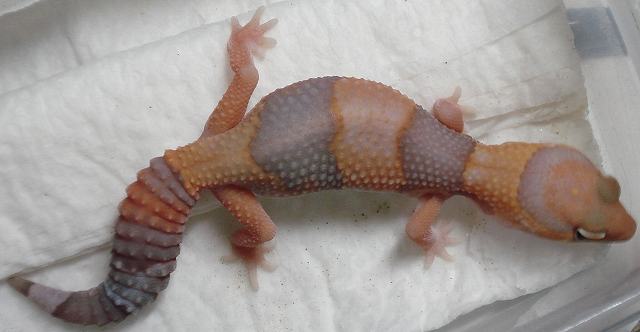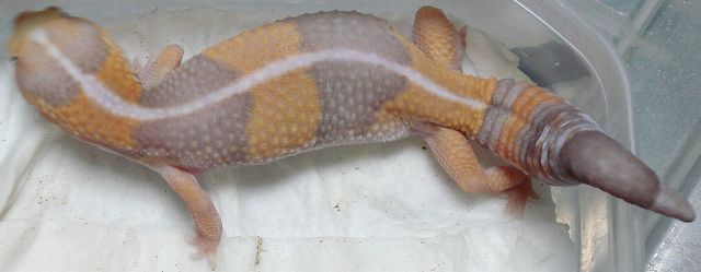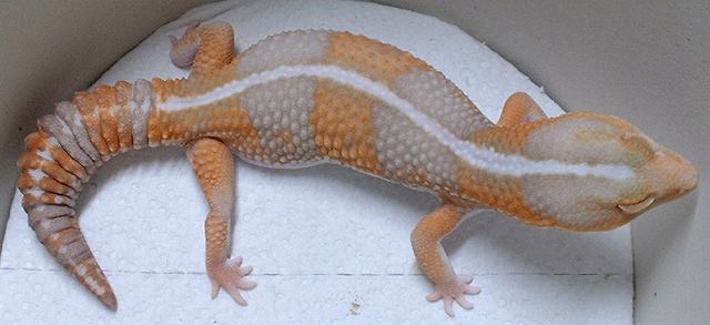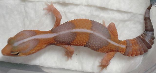 ♂ | アルビノファットテール ストライプ ■70,000円■ 産 卵:2007.5.15 ハッチ日:2007.7.5 体重:2.9g(孵化温度約30.5℃) 購入店:自家ブリード ブリーダー:日本、ヘラクレス 親:AFS12♂×AF3♀ |