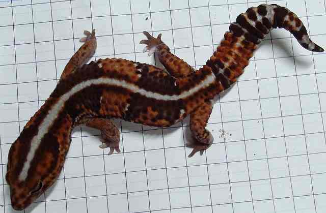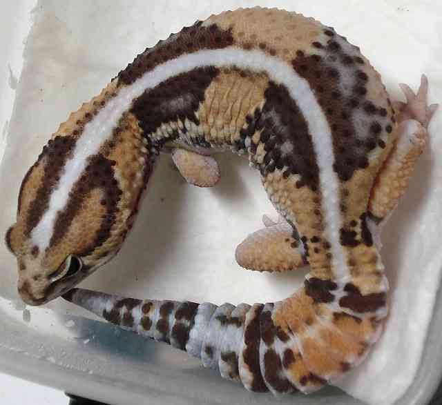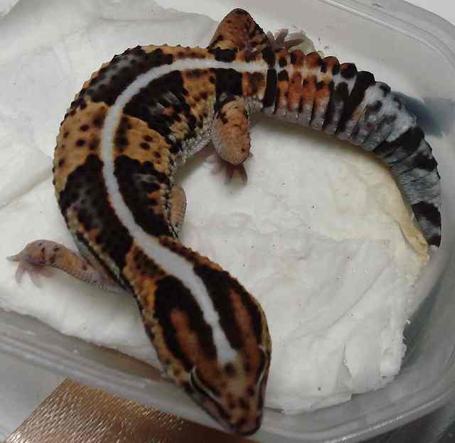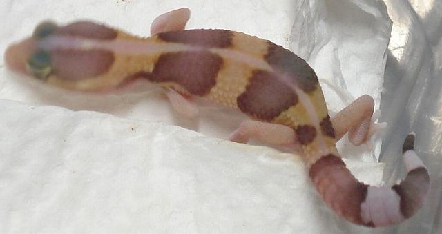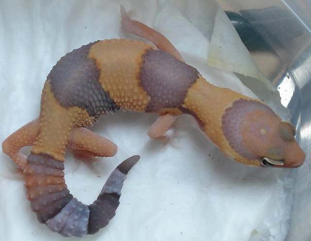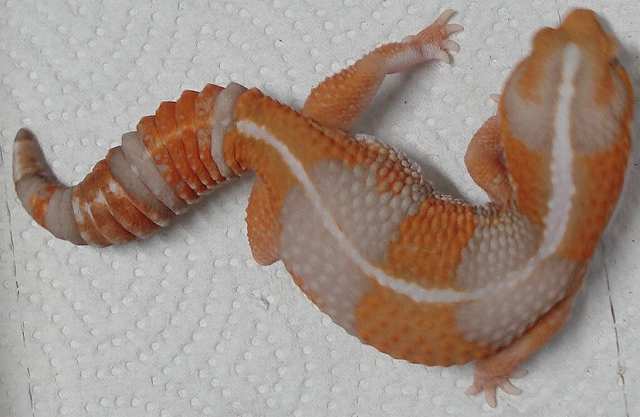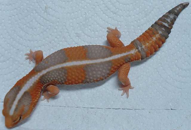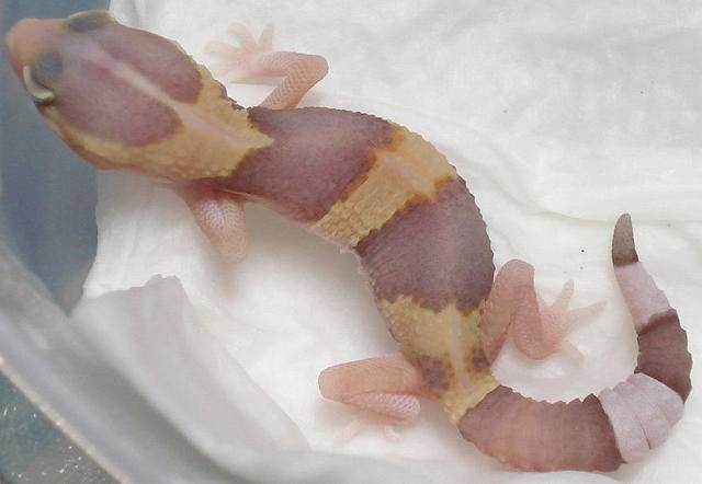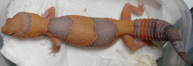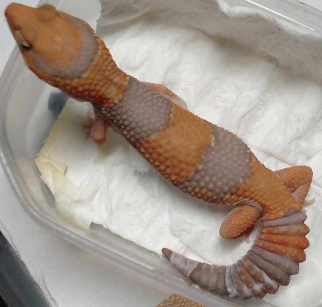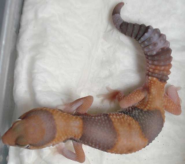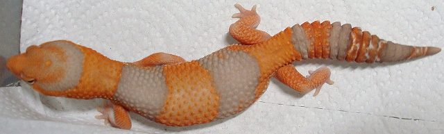 ♂ | アルビノファットテール ストライプ ■70,000円■ 産 卵:2007.5.15 ハッチ日:2007.7.5 体重:2.9g(孵化温度約30.5℃) 購入店:自家ブリード ブリーダー:日本、ヘラクレス 親:AFS12♂×AF3♀ |