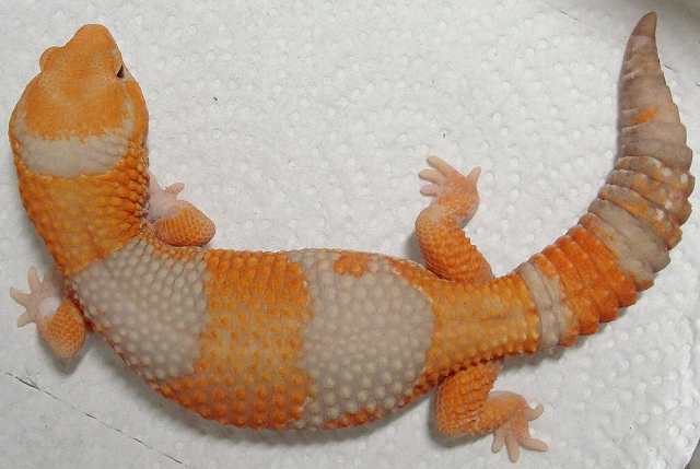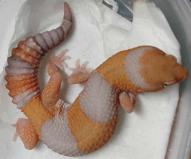 ♂ | アルビノファットテール ■60,000円■ 産 卵:2007.5.21 ハッチ日:2007.7.11 体重:3.1g(孵化温度約30.5℃) 購入店:自家ブリード ブリーダー:日本、ヘラクレス 親:AFS12♂×AF1♀ |