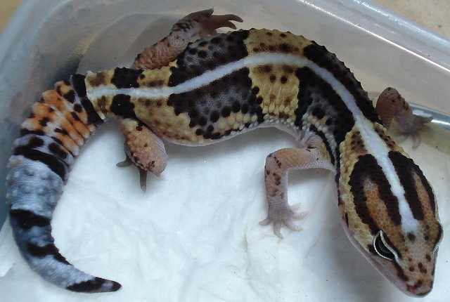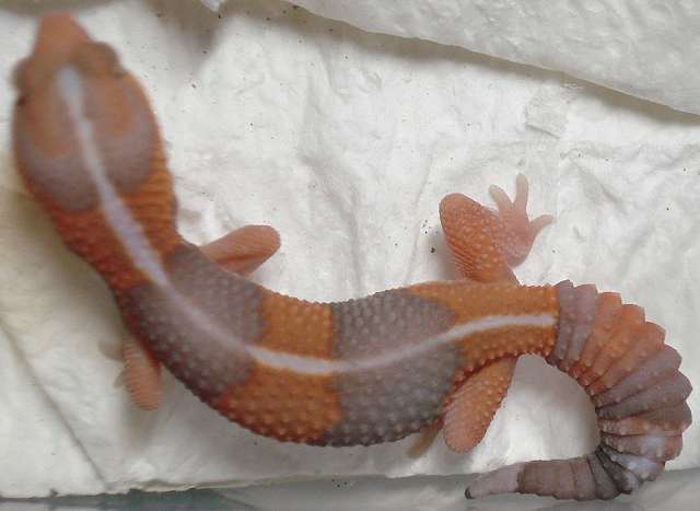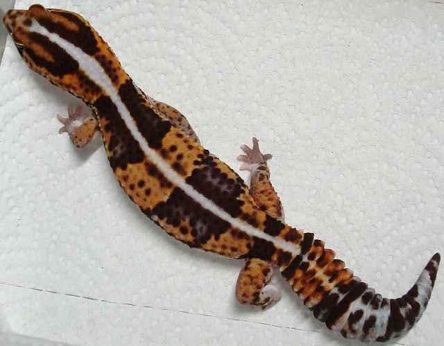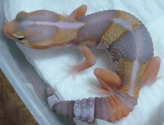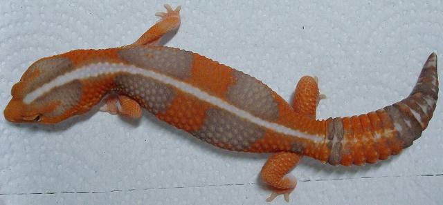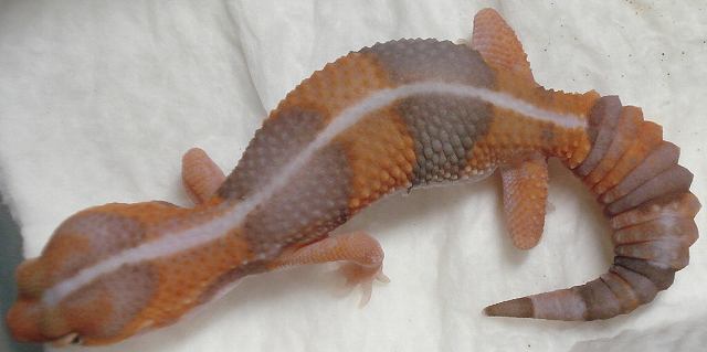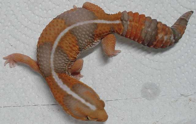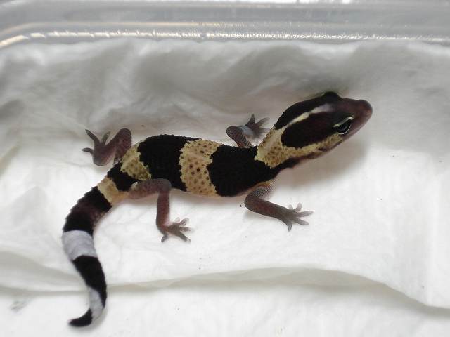 ♀ | ヘテロアルビノファットテール ストライプ ホワイトソックスでした(^^ゞ ■■売切れ■■ ■40,000円■ 産 卵:2007.3.11 ハッチ日:2007.5.6 体重:3.2g(孵化温度約30.5℃) 購入店:自家ブリード ブリーダー:日本、ヘラクレス 親:AFS11♂×FSWS1♀(ホワイトソックス) |