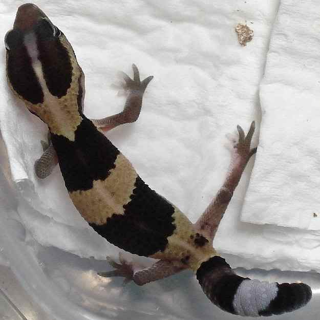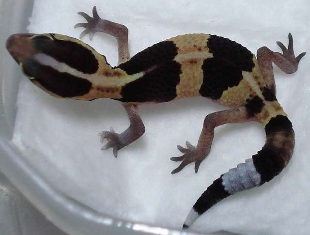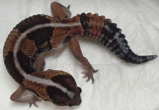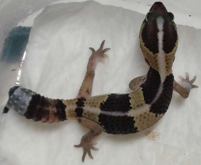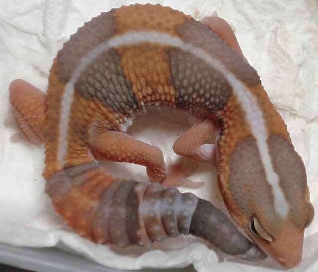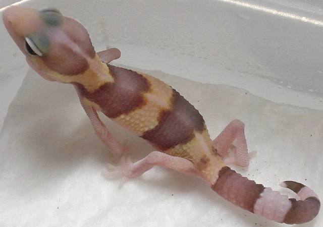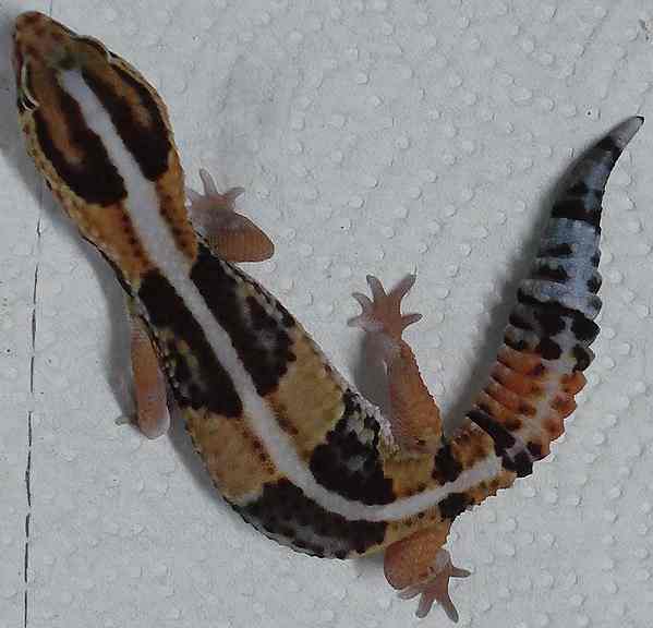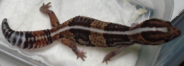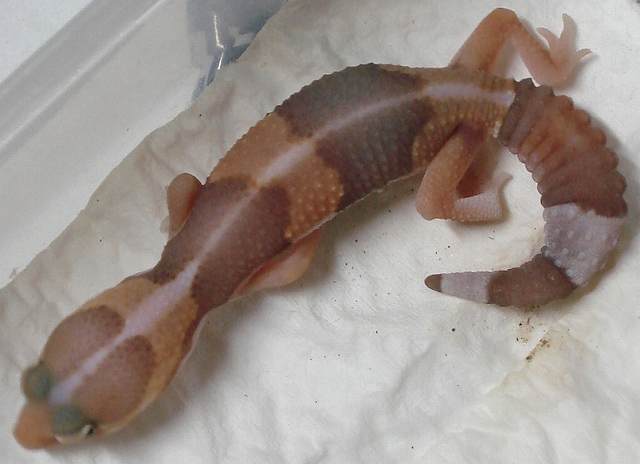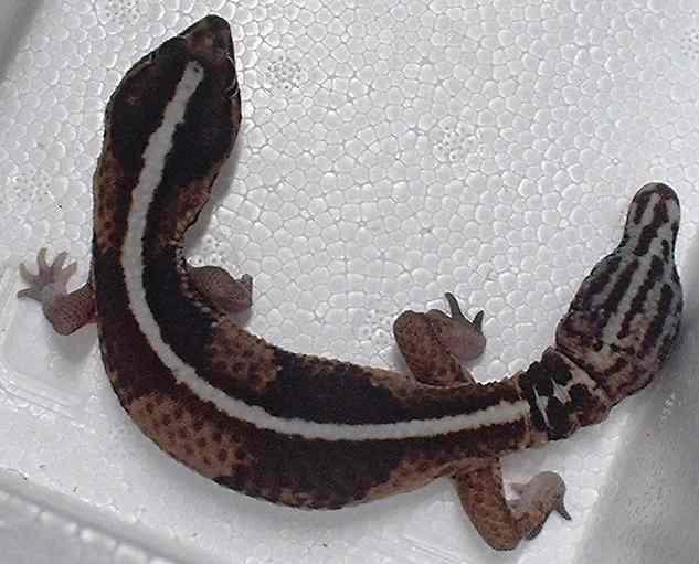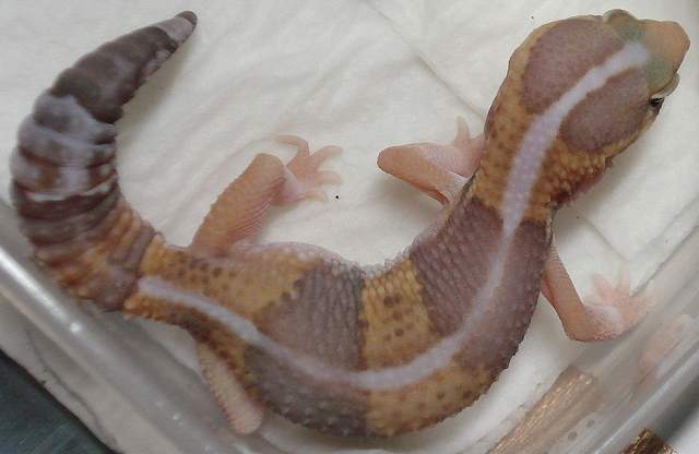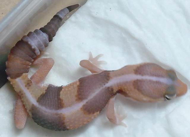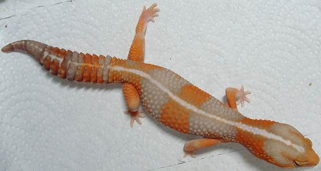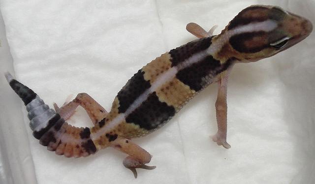 アルビノファットテール ストライプ ハッチ日:2007.6.5 体重:3.0g(孵化温度約30.5℃) 購入店:自家ブリード ブリーダー:日本、ヘラクレス 親:AFS9♂×AF17♀ |