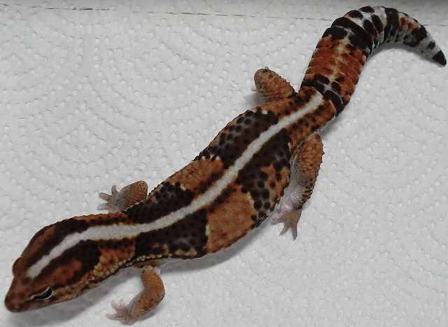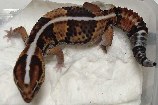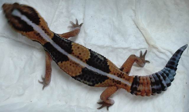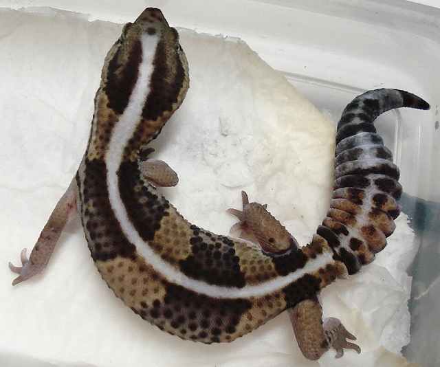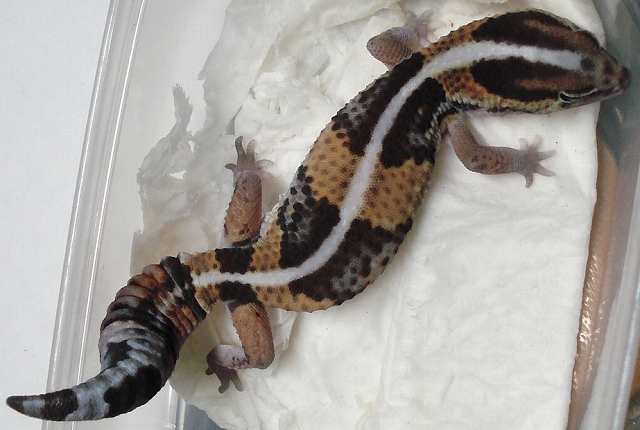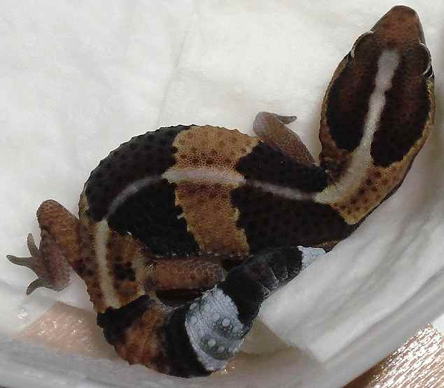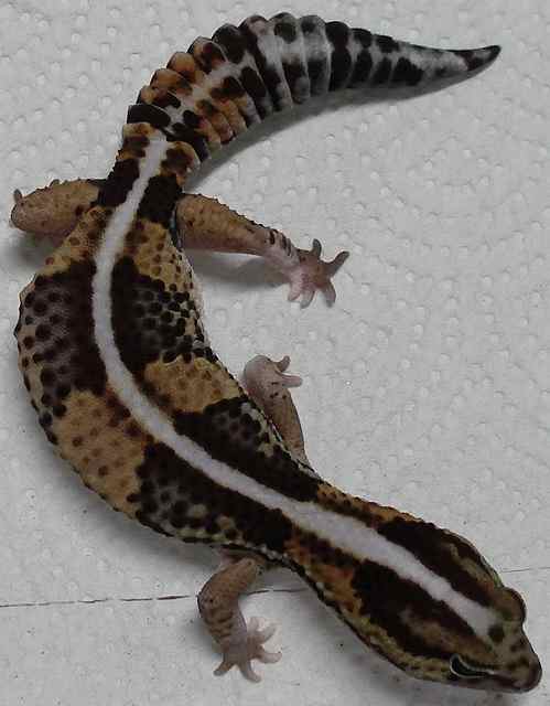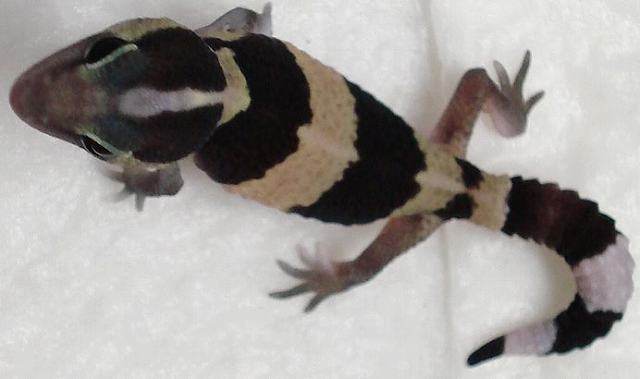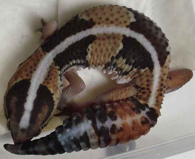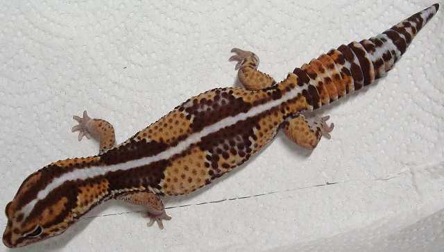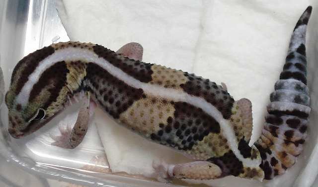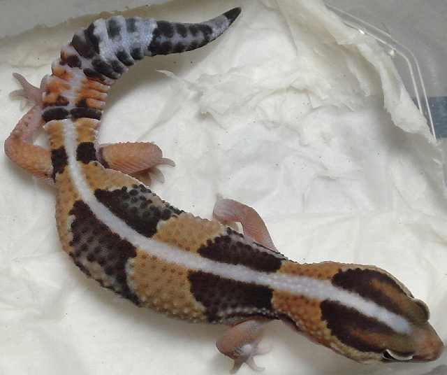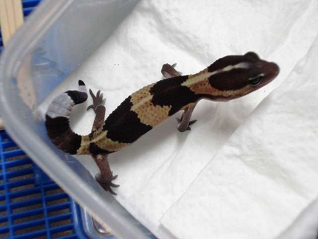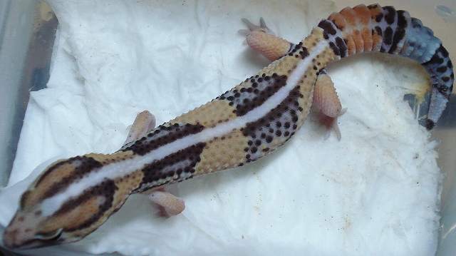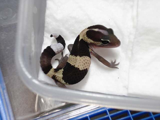 ♂ | アルビノファットテール ストライプ ■100,000円■ 産 卵:2007.6.21 ハッチ日:2007.8.10 体重:2.9g(孵化温度約30.5℃) 購入店:自家ブリード ブリーダー:日本、ヘラクレス 親:AFS9♂×AFS06−3WS♀(ホワイトソックス) |