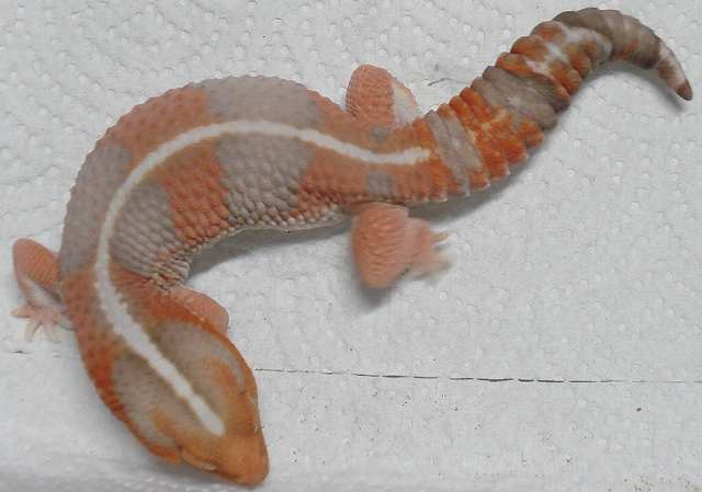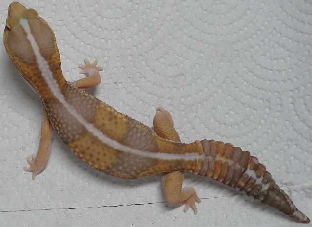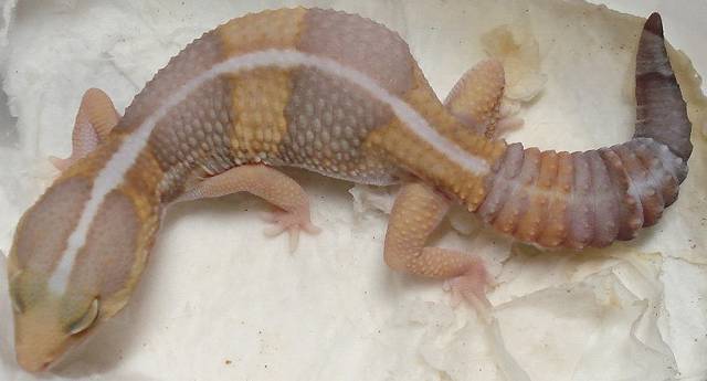 ♀ | ■AFS07−27 ヘテロアルビノファットテール ストライプ ■■非売品■■ ■円■ 産 卵:2007.5.9 ハッチ日:2007.7.1 体重:3.1g(孵化温度約30.5℃) 購入店:自家ブリード ブリーダー:日本、ヘラクレス 親:AFS11♂×FSWS1♀(ホワイトソックス) |