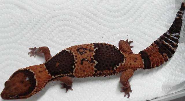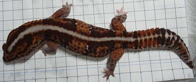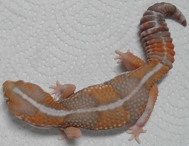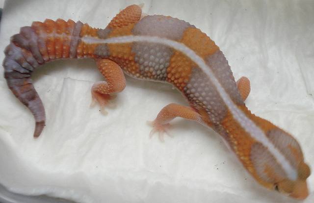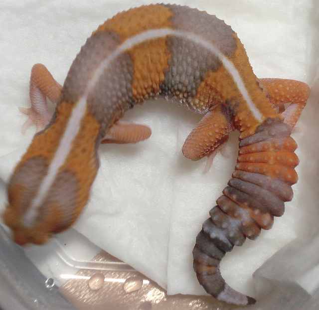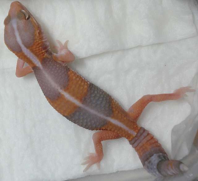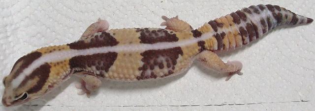 ♂ | ヘテロアルビノファットテール ストライプ ◇ホワイトソックス◇ 右後足指先2本(1〜2番) ■■ 産 卵:2007.6.7 ハッチ日:2007.7.28 体重:3.1g(孵化温度約30.5℃) 購入店:自家ブリード ブリーダー:日本、ヘラクレス 親:AFS9♂×AFS06−3WS♀(ホワイトソックス) |