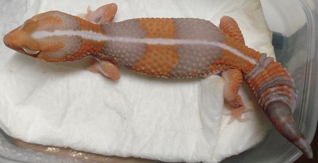 ♀ | ■AFS07−13 ヘテロアルビノファットテール ストライプ ■■売切れ■■ 産 卵:2007.4.8 ハッチ日:2007.6.2 体重:3.2g(孵化温度約30.5℃) 購入店:自家ブリード ブリーダー:日本、ヘラクレス 親:FS1♂×AF7♀ |