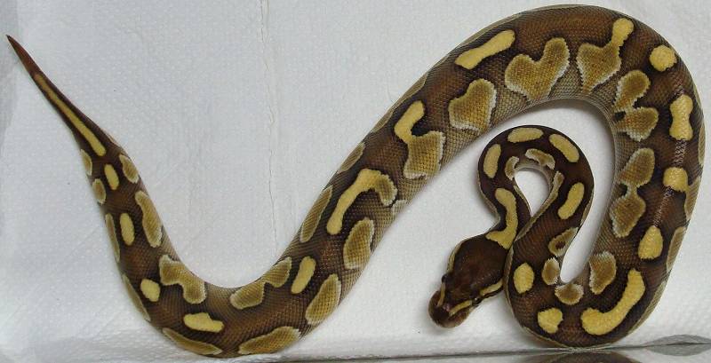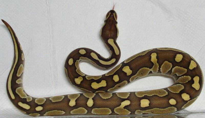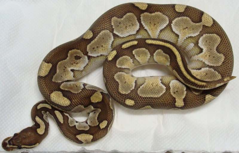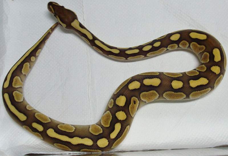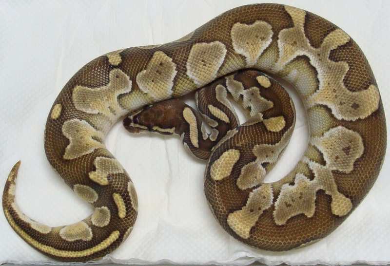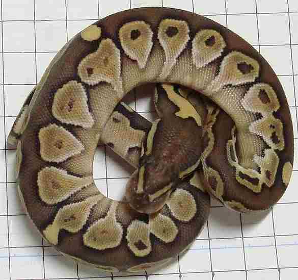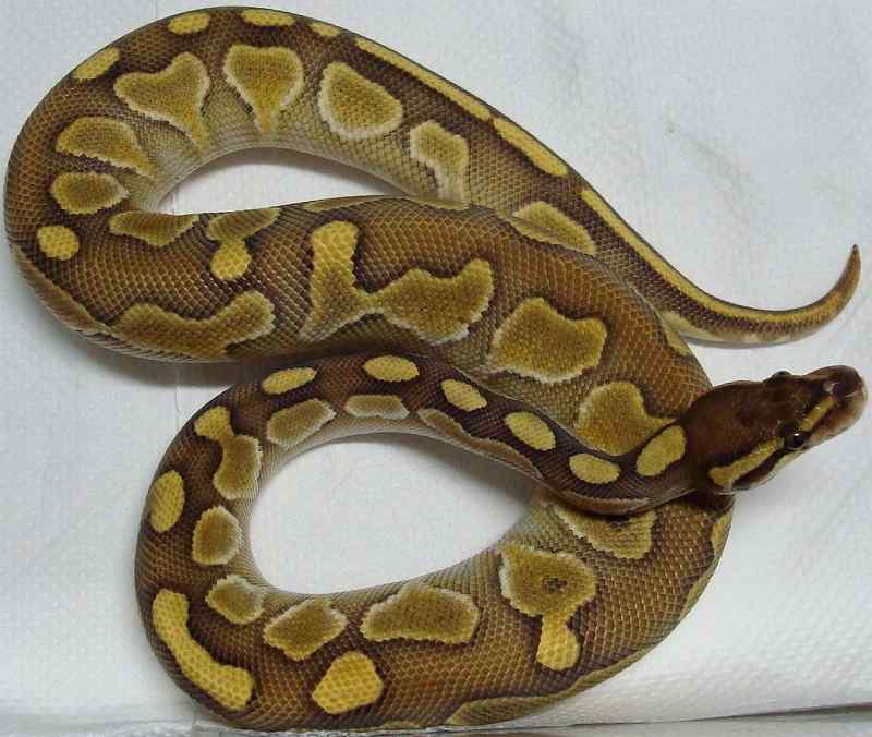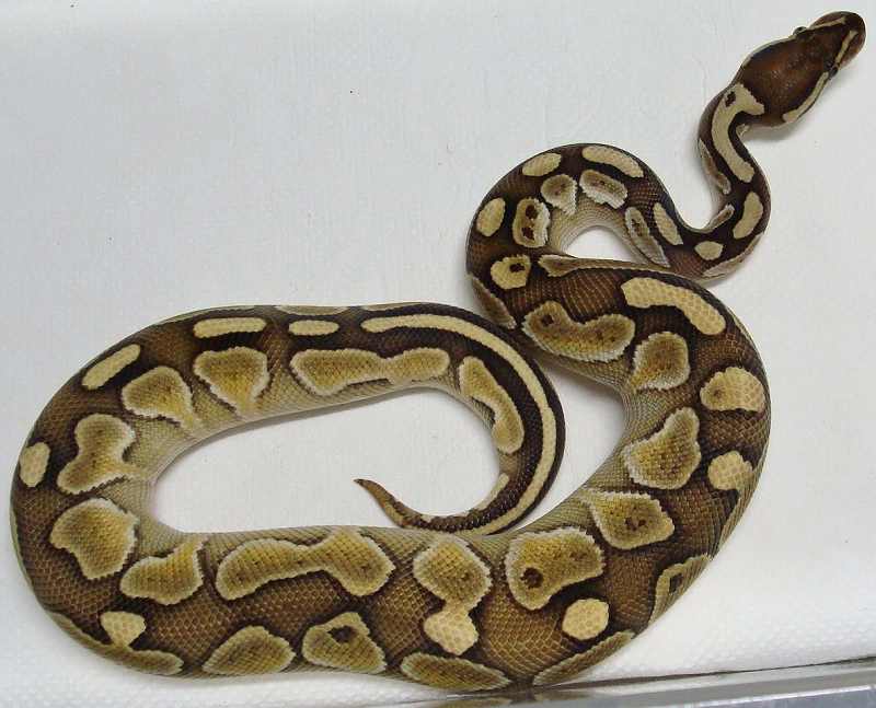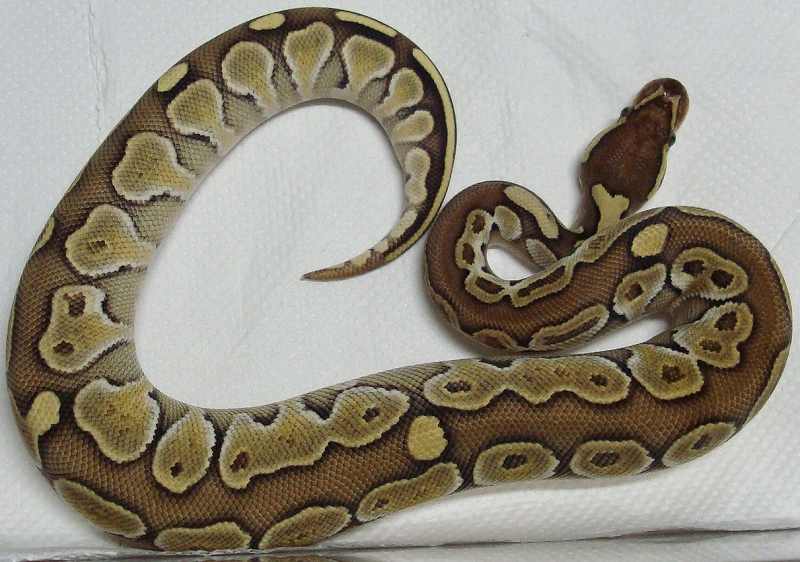 ♀ | レッサープラチナ 鼻先上面に小さな擦り傷治癒跡あり。 治癒痕画像 茶色部分が白くなり目を通過する ラインが鼻上面でつながっている ように見えます。 既に傷は、治癒していて数回の脱皮 で茶色に戻ると思います。 ■■売切れ■■ ■150,000円■ ハッチ日:2009.6.15 体重:64g(孵化温度約30.5℃) 購入店:自家ブリード ブリーダー:日本、ヘラクレス 親:BPLP1♂(50%ポッシブルヘテロパイボール) ×BP13♀ |