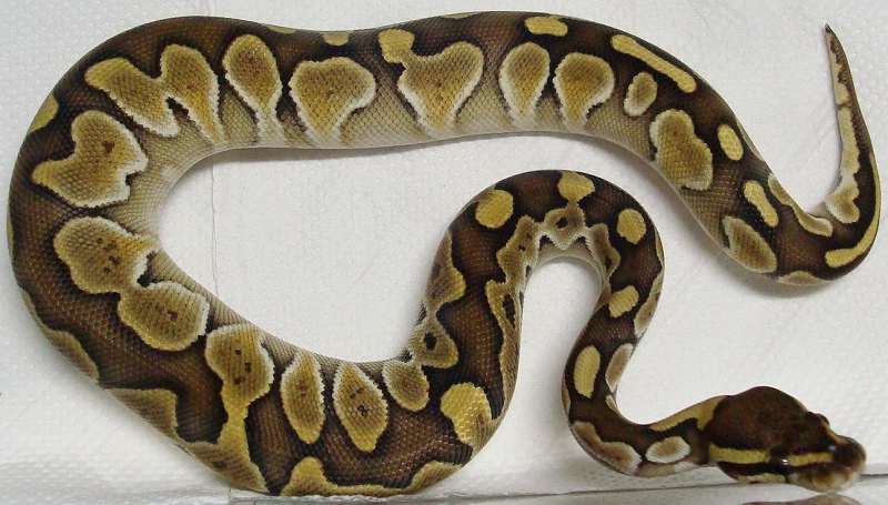 ♂ | ノーマル ■売切れ■ ■5,000円■ ハッチ日:2009.6.15 体重:63g(孵化温度約30.5℃) 購入店:自家ブリード ブリーダー:日本、ヘラクレス 親:BPLP1♂(50%ポッシブルヘテロパイボール) ×BP13♀ |