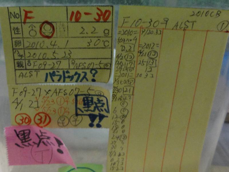 ♀ | ■F10−30 ALSTニシアフリカトカゲモドキ パラドックス? ■ 産 卵:2010.04.01 ハッチ日:2010.05.23 体重:2.2g(孵化温度約30℃) 購入店:自家ブリード ブリーダー:日本、ヘラクレス 親:F09−27♂×AFS07−5♀ |