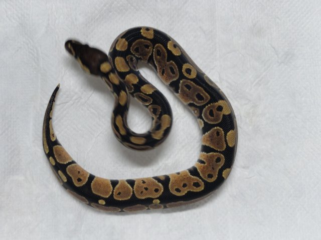 ♀ | ノーマルorキャリコ??? 現時点でキャリコの表現を確認できない のでノーマルでの販売です。 ★食いむらあり!★ ■売切れ■ ■8,000円■ 現在の餌:冷凍ホッパー 産 卵:2012.04.08 ハッチ日:2012.06.11 体重:70g(孵化温度約31℃) 購入店:自家ブリード ブリーダー:日本、ヘラクレス 親:BPCLI−2♂(キャリコ)× BP−15♀(ノーマル) |