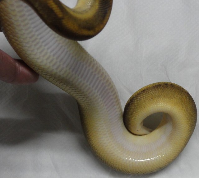 ♂ | レッサープラチナ ■売切れ■ ■50,000円■ 現在の餌:冷凍ファジーマウス 産 卵:2012.05.31 ハッチ日:2012.07.29 体重:63g(孵化温度約31℃) 購入店:自家ブリード ブリーダー:日本、ヘラクレス 親:BPBL10−1♂(ブルーアイリューシ)× BPCI−2♀(シナモン) |