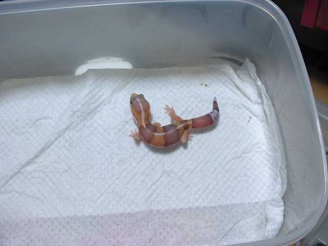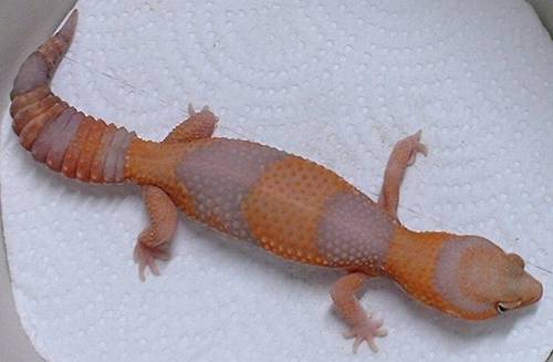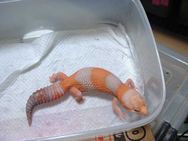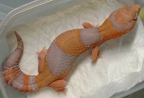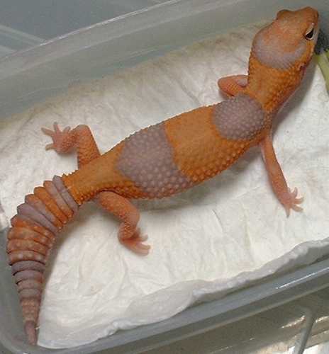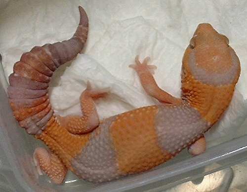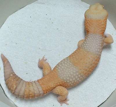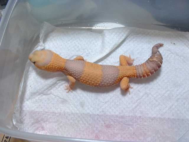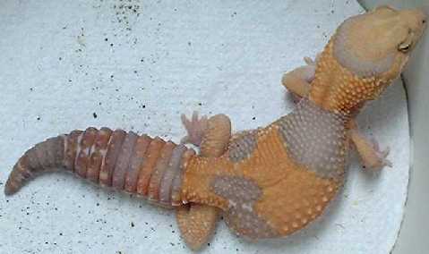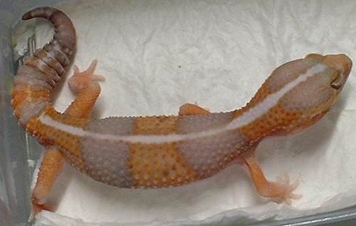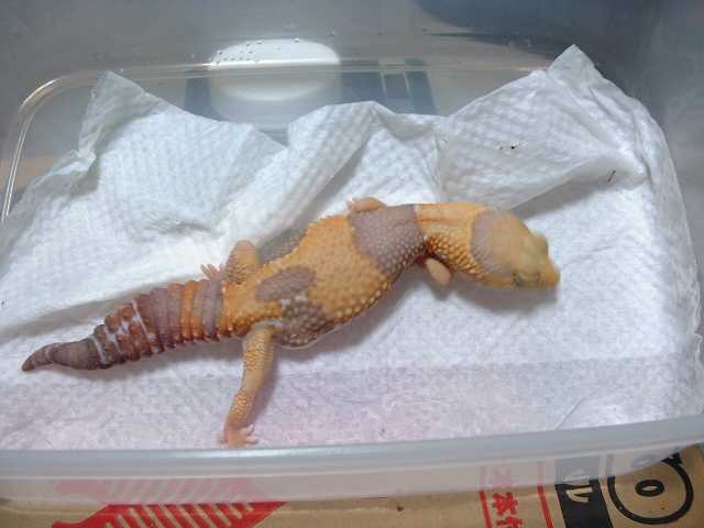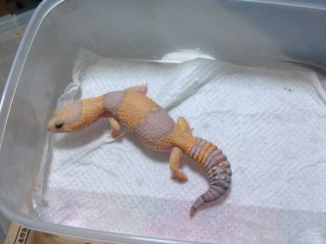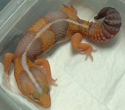 ♂ | アルビノファットテール うすいオレンジ+うすいブラウンバンド 尻尾2〜3ミリ欠損・治癒済み尻尾画像 約1ヶ月半、約22℃でクーリング処理済み |