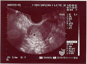 5週目の妊娠発覚時のエコー まだまだちっちゃくて何がなんだか・・・ 5.4ミリです。 |