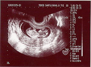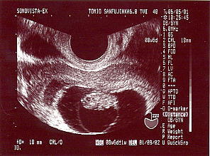 12週目のエコー 赤ちゃんは正面を向いてます。 手足がピョコピョコ動いてるのが わかりました。 やっとこさ45ミリです。 とりあえず宇宙人みたいだけど、 なんとか人間っぽくなってきました。 |