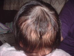 頭を左右に振るんで後ろの毛が切れちゃって一文字ハゲになっちゃってます。