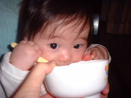 離乳食2日目の様子・・・ もうスプーンで入れてもらうのが待ちきれなくって器をひっつかんで犬食いです。