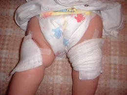 けーなはアトピーです。 で、膝を掻きこわしちゃったんでお風呂上りにガーゼを貼って、包帯を巻いて、
