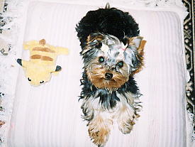 だいぶ大きくなってきて髪ものびて ボウボウです。しょうがないので くくろうとしたのですが、飼い主が 不慣れなもんでちょんまげに なってしまったんです(T△T) 毛玉もひどくて一番きちゃない時 です。となりのピカチューはtamaの お友達がくれたもの。 なぜかお気に入りで取られちゃい ました。 |