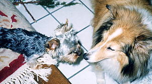 ルルがうちに来てしばらくは予防接種が済んで なかったので、リンに会わせませんでした。 リンは外で遊んでるからダニとかいてるだろうし。 会わせたのは半年が過ぎてからかな。 リンはいやーんって感じでした。 ルルは他の犬を見たことがあんまりないせいか 興味津々の様子。 でも、リンが知らんぷりなんで 振り向いてもらおうとぎゃんぎゃん吠えてます。 もうちょっと赤ちゃんの時に会わせておくべき だったのかなぁ。ルルの方がえらそうでちょっと リンがかわいそうになっちゃうのよね。 |