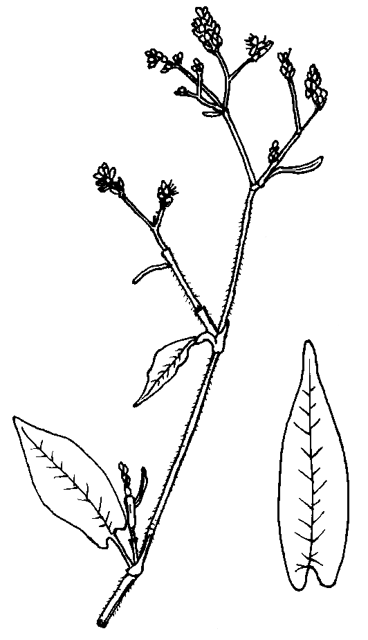 葉: 互生、葉柄あり、葉毛あり、葉裏刺小さい、葉卵長形あるいは葉三角長形基部切れ込む、全縁。