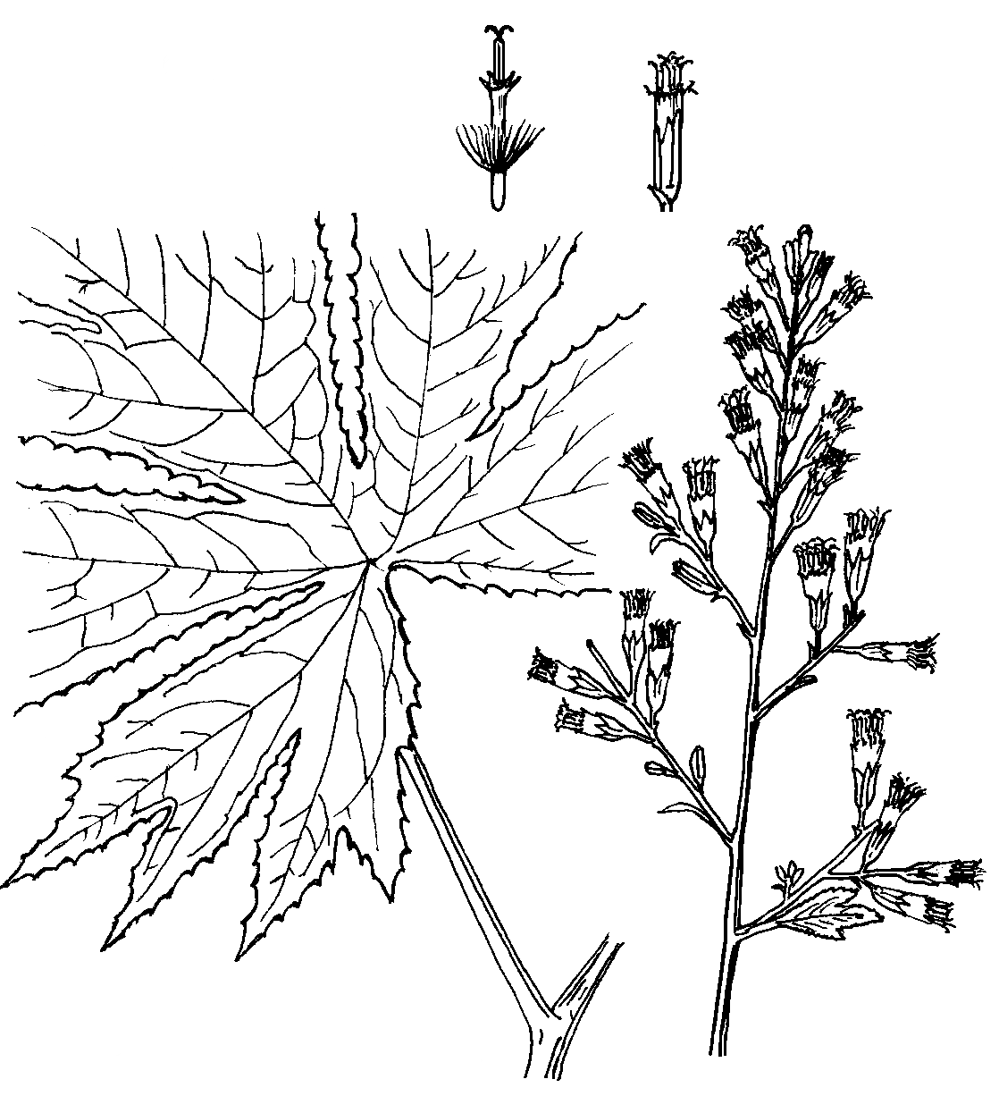 花: 夏、花黄淡、頭状花(5−10小花)多い、円錐状総状の花穂、管状花、花軸毛褐色、総包長1.5−2cm、総包片5。