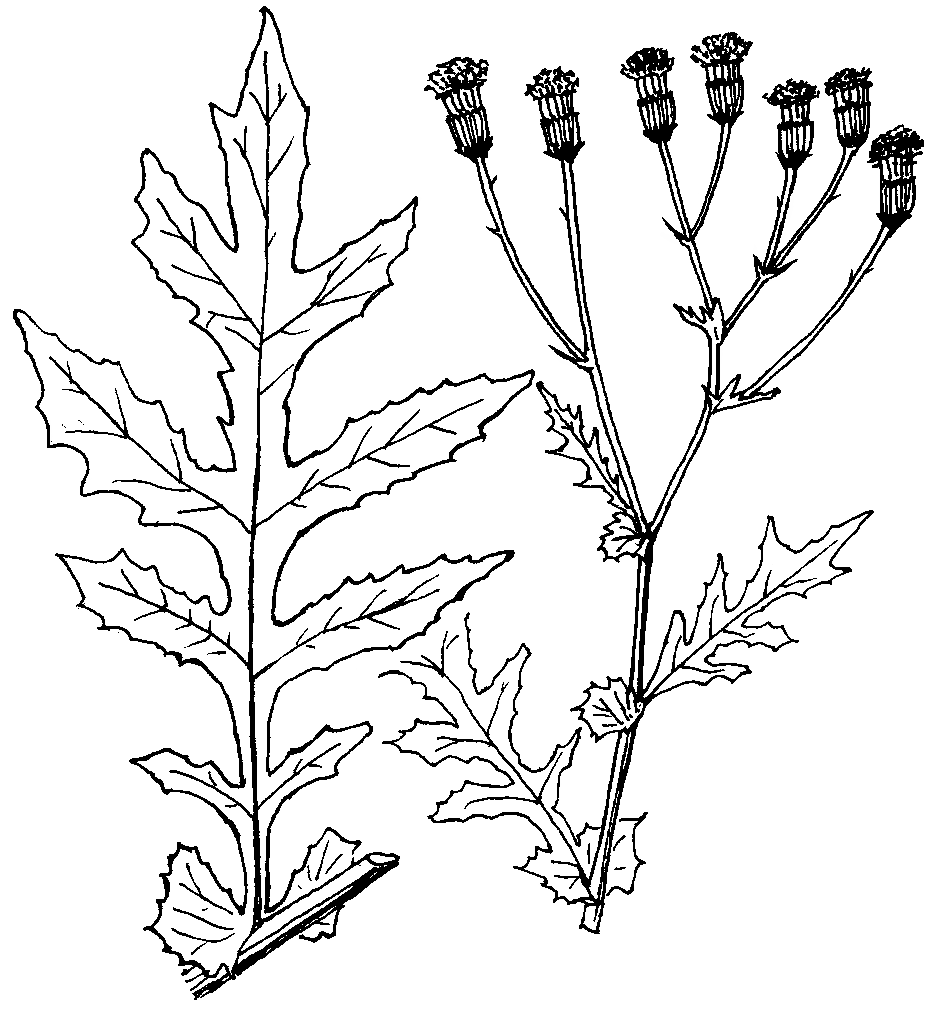 葉: 互生、葉被針形あるいは葉卵長形、葉羽状深裂3−4対、葉縁欠刻状、裂片矛状、葉紫帯びる、鋸歯不揃い。