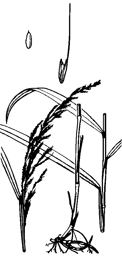 花: 秋、花紫色を帯びる、茎先に長さ30cm位の弱々しい円錘花穂、花穂皮針形、一方に傾く、枝穂は相接して密生、多くの小穂をつける、小穂は繊細な芒(のぎ)長1−2cmあり、小穂は1花からなる、包頴2個卵形護頴より小形。