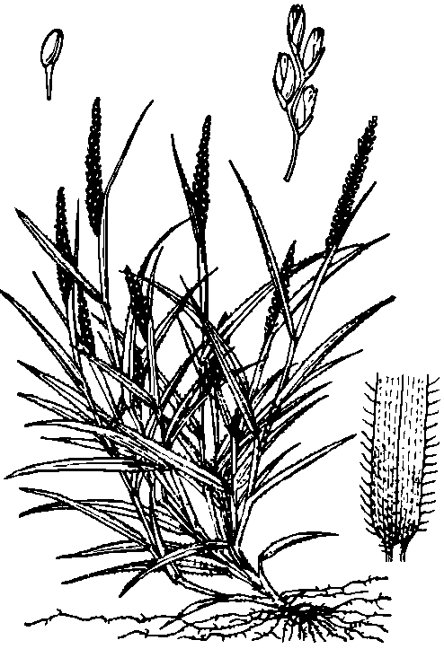 参考: 髭芝、葉の縁に毛長いのでこの名。ヒゲシバ、チカラシバなどの総称は「シバ」。万葉集「立ちかはり古き都となりぬれば道の志婆(しば)草長く生(お)ひにけり」(巻6−1048)。