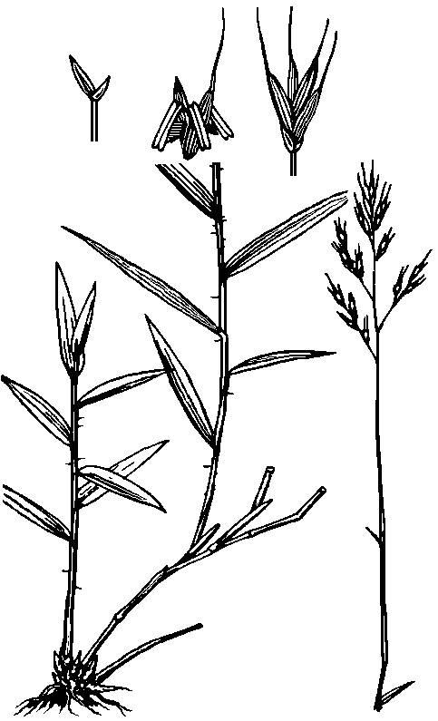 花: 秋、花紫色、茎先に長さ5−7cmの小さい円錐花序、1−2回分枝、花少ない、小穂長0.7cm位、小穂柄細い、小穂3−4花からなる、包頴卵楕円形膜質、護頴より短い、護頴、内頴同長、護頴先3歯、中央歯は芒となる、柱頭紫色羽状。