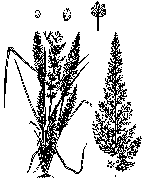 花: 初秋、8−9月、花赤紫淡色を帯びる、茎先に長さ20−60cm、巾3−4cmの円錐花序直立、2−3回分枝、細長い柱状の花穂に多くの小穂をつける、小穂卵形あるいは楕円広形偏平先尖り長さ0.1−0.15cm、小穂3−5花からなる、包頴2個楕円広形先凹むことあり、護頴楕円形3脈、中脈目立つ、護頴長0.9cmで包頴よりやや長く滑らかで芒なし。