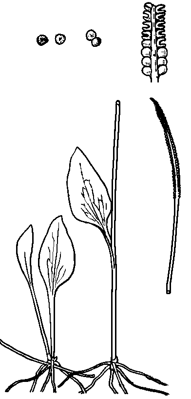 葉: 根生葉直立単生あるいはまばら、葉柄上部で栄養葉と胞子葉に分岐、生育悪いときは栄養葉のみ、栄養葉下部に1−2枚、葉卵長形先尖る、葉基部くさび形、葉巾0.8−1.5cm、全縁柔らかい、網状脈、上部に胞子のう穂1本、胞子葉高さ10−20cm、胞子のう穂線形、あるいは棒状。