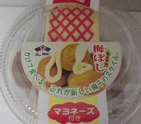 | 梅干にいろんなものをかけて食べるのが、新しいスタイルだそうです。 マヨネーズに梅肉を混ぜるのは別に珍しくもなんともないんだけれど、 「上にかける」ことにこだわっているところは確かに新鮮だわね。 この梅干にかけてびっくりシリーズですが、 他にもごま・海苔・ゆかり・のりたま・蜂蜜とバラエティが豊富で、 いずれもかける素材はきちんとした他社ブランドです。 マヨネーズだとキューピーだったし、のりたまは丸美屋、はちみつはサクラ印等々。 ここまでこだわってるのに、 かけたものと梅干の味が、無難で新鮮味がないのは惜しい! それでもってトッピングは一袋だけなので、かけたら最後。 5・6粒入りの梅干を、一度に全部は食べられませーん! 228円也 製造者 南紀梅干株式会社 |