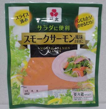 | 赤いだけのかまぼこかと思っていたら、 なんとなく風味はスモークサーモン?という仕上がりで、 サラダにして食べましたが普通に美味しかったです。 サーモンとはいっても蒸しかまぼこなので、 触感は別ものですけどね。 「魚肉中には、サーモンは使用しておりません。主原料:魚肉(たら)100%」 という但し書きが、なんとなくおもしろかったので、記録しておこう。 たらだけどサーモン。スモークサーモンだけどかまぼこ。 142円也 販売者 株式会社紀文食品 |