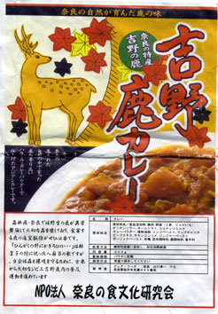 | 奈良県吉野(桜が有名なところ)の、食害により駆除された鹿で作ったレトルトカレー。 味はあっさりとしていて、どちらかというとスープカレーっぽくもあり、 鹿肉もごろごろ入っていておいしかったです。 それはいいとして、売っていた場所については、まずいんじゃないでしょうか。 この夏奈良公園で開催された祭にて販売されていたのですが、 知らない人のために言うと、ここの鹿は神の使いとされていて、 鹿せんべいをねだる愛らしい鹿を、「あー、やっちゃったのかな」と思ってしまうような、 まぎらわしい場所での販売は、NPO法人さん、いかがなものでしょうか。 500円也 販売者 ピュア・フーズ |