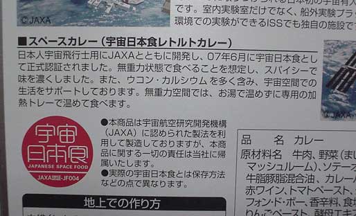 | ママさん宇宙飛行士の山崎直子さんが宇宙へ行った時にアップする予定だったのに、 気が付けばとっくの昔に帰還してましたよ。あーあ。 で、遅ればせながらなのですが、 このカレーの書かれている宇宙日本食って何だろうと思い、 JAXAのホームページにいくといろいろ書いてありました。 簡単に言うと、 「JAXAが宇宙食として認証した食品」のことを宇宙日本食というそうです。 宇宙用にクリアしなくちゃならない問題が色々あるみたいですが、 それらを満たしてJAXAのOKがでれば、晴れて宇宙日本食を名乗れるというわけです。 関係ないけど、他の国の宇宙食はなんていうんだろうね。宇宙洋食? 味ですが、パッケージにもあるとおり濃いめのカレーでした。 なんで無重力だと濃い味になるのか、理由が明記されてないのでわかりません。 JAXAさま、この問題もクリアしてください! 500円也 販売者 ハウス食品株式会社 |