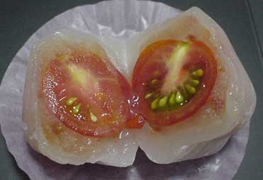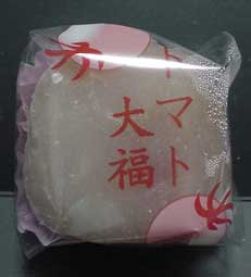 | プチトマトが丸々1個入った変わり大福です。 そもそも、トマトって果物なんですか? フルーツトマトなど、かなり甘味のあるトマトはあるけれど、 どんなに甘くても、フルーツとは違う、 野菜独特の青臭さがあるんですよねぇ。 この大福も、やわらかな求肥と爽やかな餡から、 いきなり弾けたトマトの青臭みが登場するので、 なんとも微妙だなと思いながら食べました。 これといっしょに、ブドウ1粒が丸々入った大福もいただきましたが、 やっぱりね、大福に入れていいのは果物だけです! 198円也 製造者 株式会社青木松風庵