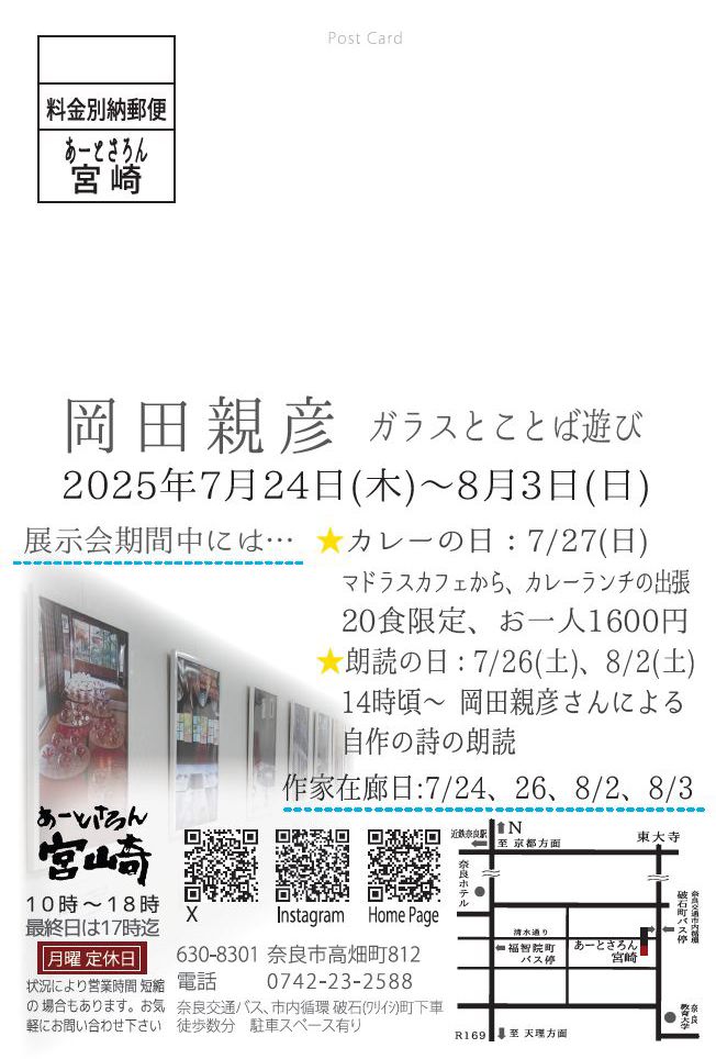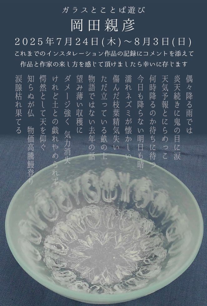 窓ガラスに使う板ガラスを加工して作品を作り続けてこられた岡田親彦さんの作品展。今回も、丹波篠山からマドラスカフェさんのカレーランチの出張の日が有ります。(限定20食、ご予約は前々日まで)