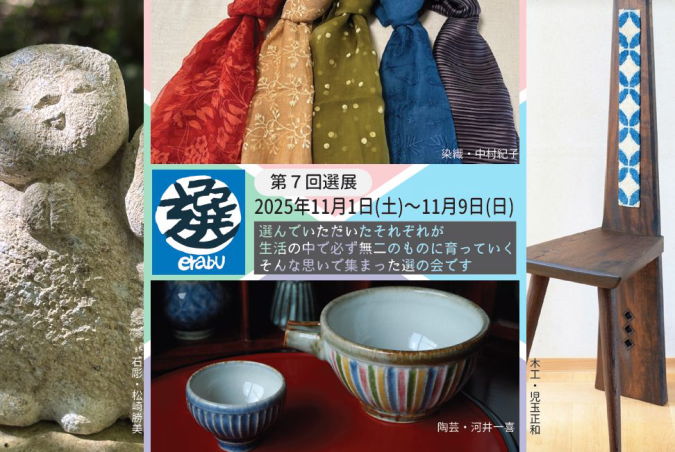 今回は、石彫・松崎勝美さん、陶芸・河井一喜さん、木工児玉正和さん、染織・中村紀子さんの4人のメンバーでお送り致します。