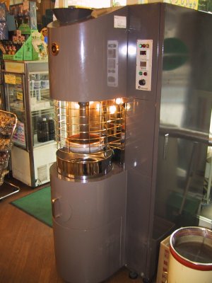 ●当店は左の写真の最新式焙煎機 ジェットロースター使用 500gを130秒と言う速さでロースト!これがご注文を いただいてから焙煎できる秘密なのです! しかも、お好みの焙煎度合いでローストできます。