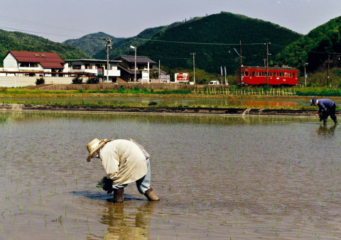 農作業の機械化が進み、最近では見かけることの少なくなった手作業による田植え。 地元の方によれば、昭和ひとケタ生まれの電車との組み合わせが見れるのも あとわずかとのこと。「手間・暇」かけたものの良さ、忘れたくないものです。 Back Next