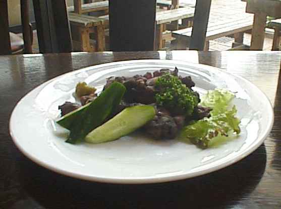 メニューは、フライドポテトチーズ焼き650円、ナンピザ800円、ホタテバター焼700円など。もちもちした歯触りが楽しいイモ揚げ餠600円。地鶏、地頭鶏(じどっこ)料理では、香ばしい炭火焼800円、カルパッチョ風700円、キエフ風700円など。肉料理ではステーキ1000円、ソーセージセット800円など。
