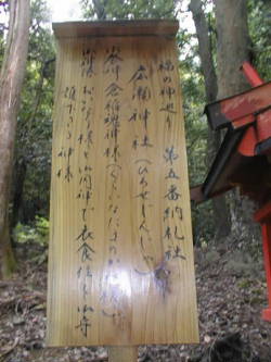 御祭神は五十猛命様・大屋津姫命様・抓津姫命様 (いたけるのみこと・おおやつひめのみこと・つまつひめのみこと)です。 御神徳は山林・樹木を守って下さる神様です または生命の根源、神の気を司る神様でもあります。 五十猛命は天上界から樹木の種を持って天降り、 日本中にその種をまいた国土を緑化されました。 |