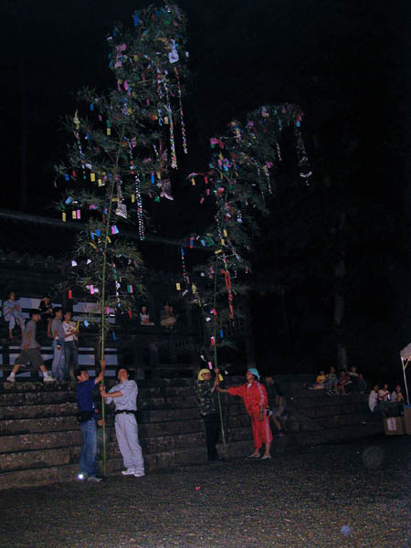 銀河まつりのクライマックスは、子ども達が願いを込めて飾った大笹奉納です。2本の大笹を幻想的な音楽とともに立ち上げて本殿まで引き上げ、奉納します。