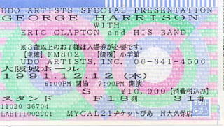 さて、いよいよ、ジョージの登場です。まあ、なんといっても元ビートルズですよ。解散後とはいえ、生で見られる日が来ようとは。中二の時に、テレビにしがみつく様に見ていた、ビートルズ。たった一人とはいえ、生きているうちにコンサートを見れるなんて想像もしていませんでしたから。エリックもジョージのステージの間は、バックに徹していて、好感が持て持てました。二人の間には、いろいろなことがあっただろうに、友情を発揮して、競演する姿にはほんと、涙してしまいました。これ以降、結局ジョージはソロコンサートはしていないのですから、私にとっても宝ものの経験です。