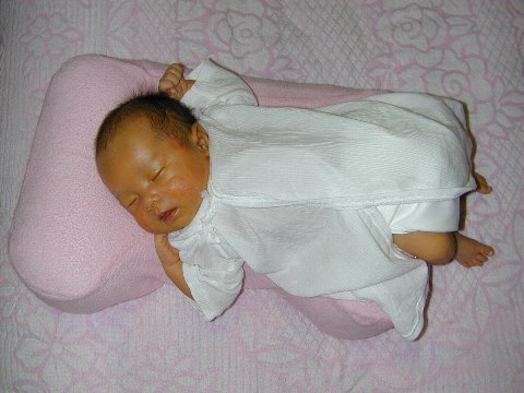 このピンクのクッションは、 おっぱいを飲ませるときに使うもの なんだけど、なぜかこの上で、 気持ちよくねんねしてしまうきみぴよ。 |