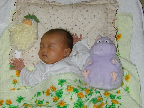 | 「アイーン」しながらねんね。 となりのガーゼハンカチが こんなに小さい。 きみぴよが小さいんかぁ。 |