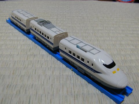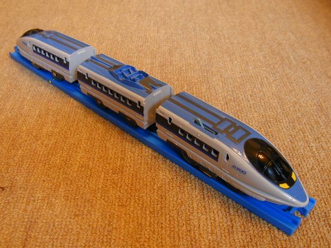 JR東海とJR西日本共同開発による現在の東海道山陽新幹線の主力車両。 効率と快適性に配慮した車両であるが、速度はダウンし、カッコもいまいちである。 所長の知り合いが、「靴べらのよう…」と評した700系であるが、本物よりも、プラレールの方が、カッコの悪さはましだと思う…。 |