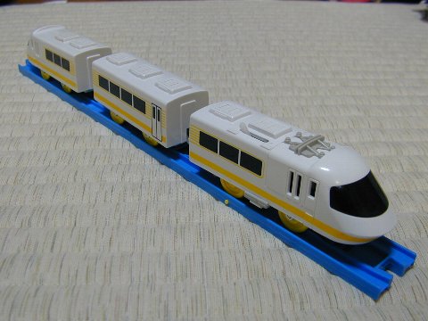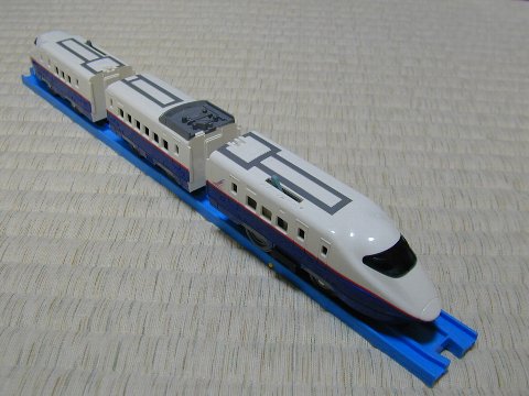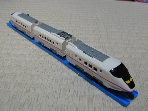 長野新幹線向けに開発されたE2系の東北新幹線バージョン。 こまちや、つばさとの連結装置を有している。 はやての登場により影が薄くなってしまった。 じゃぁ、今まで走っていたやまびこはどーしたんだぁ? これは、上のこまちのプラレールと本当に連結するようにできていて、連結しないときは、ちゃんと連結器が隠れる優れものである。 ただし、連結は磁石のため、走っていると、カーブを曲がるときに、よくはずれたりする。 |