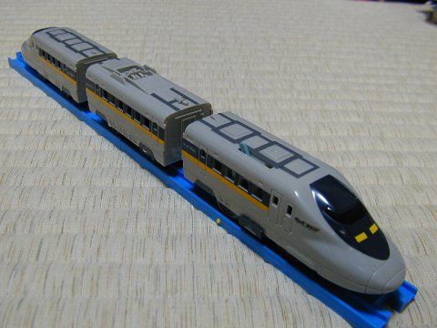 わずか9本だけ存在する最高速度300km/hの世界最速鉄道車両。 最大の特徴はその速度と文句なくかっこよいスタイル。 所長が、入社後初めて設計に参加した車両である。もうこんな車両は2度と作れないだろう。 奈良の家に、トーマスのレールセット(入れ物の箱の蓋がトーマスの顔になっている…)と一緒におていあるので、向こうに行ったときに、きみぴよが遊んでいる。 |
