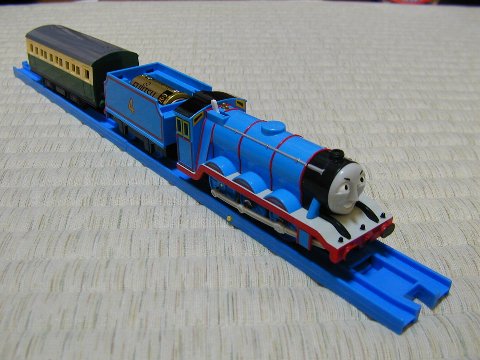 いばりんぼうのゴードン。 彼の最大の誇りである急行列車牽引時の晴れ姿である。 本当は、電池を隠すための蓋がついていたのだが、現在行方不明中…。 きみぴよは、トーマスシリーズでは、このゴードンが一番のお気に入り。 顔怖いと思うんやけど…。 |