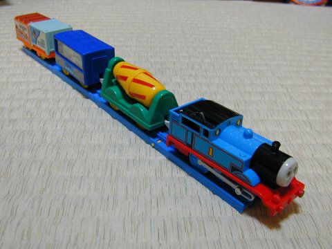 物語の主役トーマス。 本来なら相棒は客車のアニーとクララベルだが、我が家では、ぐるぐるまわるおもしろ貨車たちと、コンビを組んでいる。 青い貨車は、水族館になっていて、走ると中の魚の絵も、ぐるぐる回って、子どもたちに結構人気がある。 |